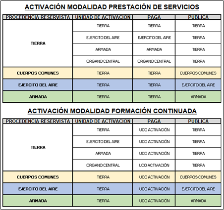 La aplicación tan solo va a ser desarrollada para el ámbito del ET. Sin embargo, existe la posibilidad de que un reservista perteneciente a otro Ejército sea activado en una UCO del ET, por lo que esta activación la tendría que publicar el Ejército al que pertenece el reservista pero el coste correría a cargo del ET. Además, existen varias modalidades de activación dependiendo de las cuales la activación la pagará uno u otro organismo. El resumen de toda la casuística se resume en el siguiente cuadro: